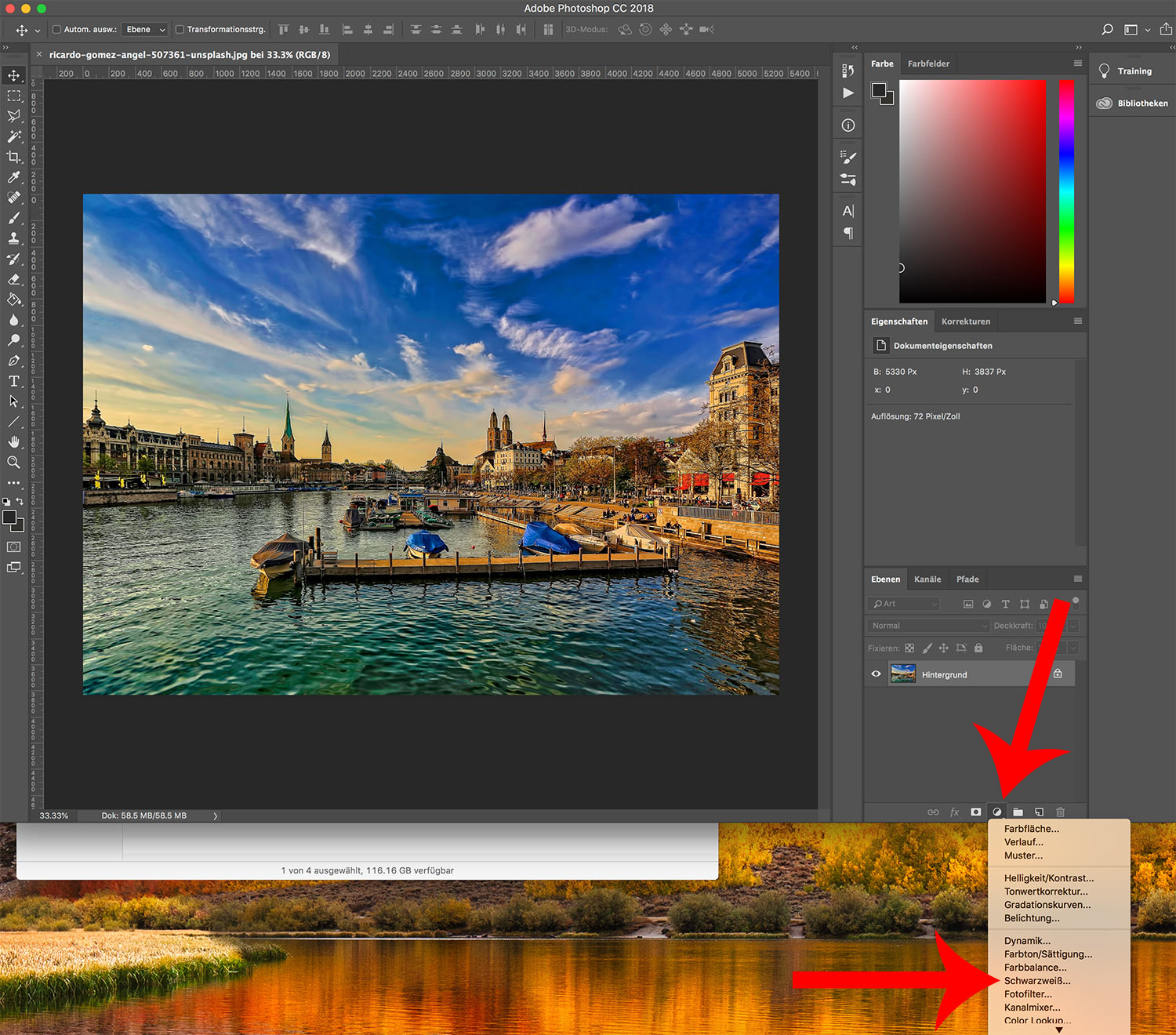 Als nächstes gehen wir rechts Unten in die Einstellungsebenen-Menu und wählen da „Schwarzweiss“ aus