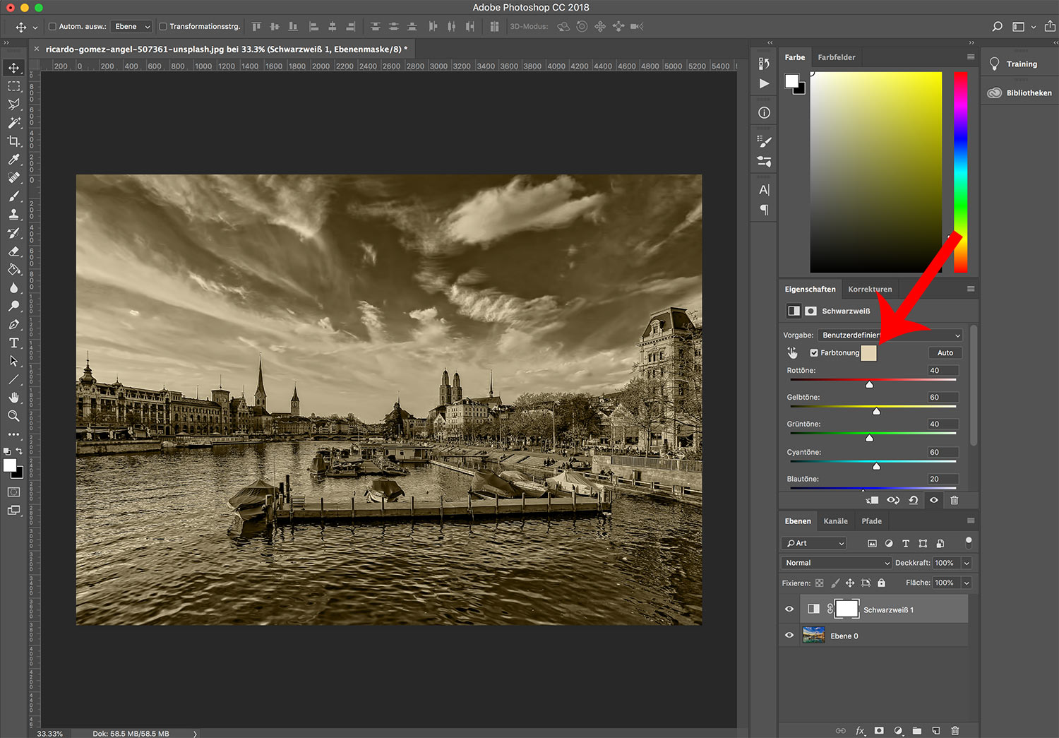 Das Bild ist nun in Schwarz/Weiss und wir können es nun umfärben und klicken dafür auf das kleine Kästchen „Farbtonung“