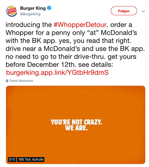 Sie haben im Dezember eine Kampagne „Whopper Detour“ gemacht, dazu haben sie die Fastfoodkunden aufgefordert sich in die Nähe des Konkurrenten Mc Donalds zu stellen, die App zu öffnen und dort einen Whopper für 1 Cent zu bestellen.
