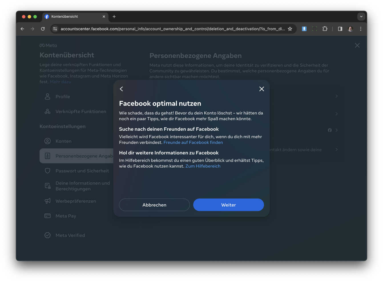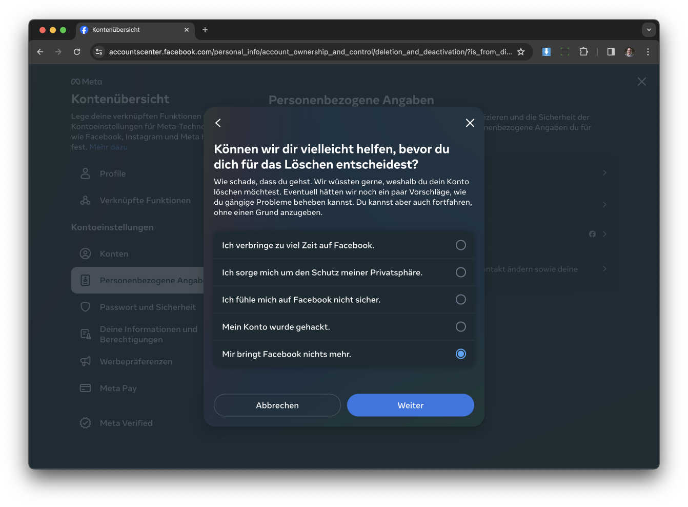 Jetzt fragt euch Facebook warum ihr löschen wollt. Ich sage meinen Kunden immer, klickt auf „Facebook bringt mir nichts“