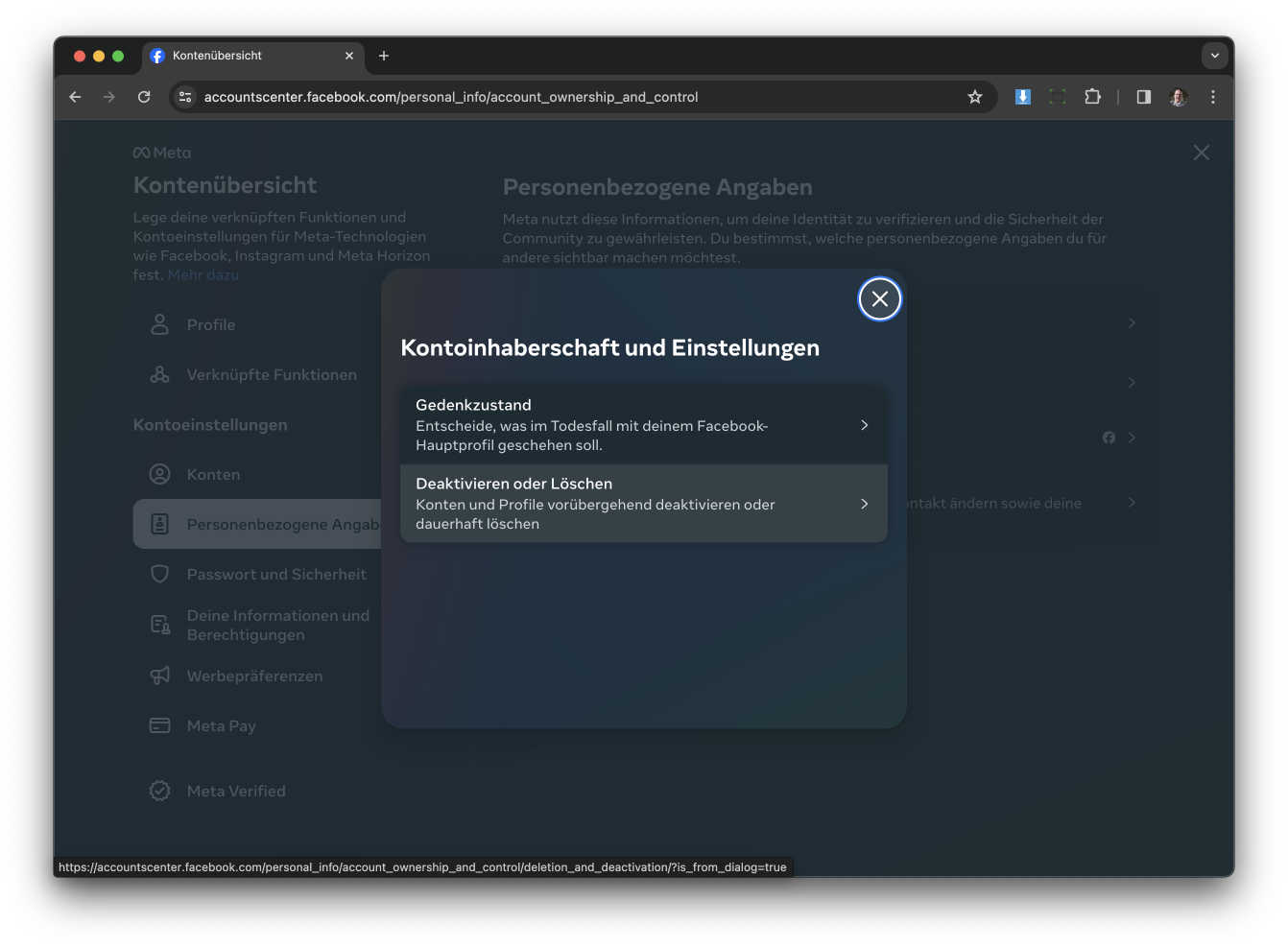 Wir wollen ja ein Konto löschen und nicht in den Gedenkzustand versetzen also klickt ihr auf „Deaktivieren oder Löschen“