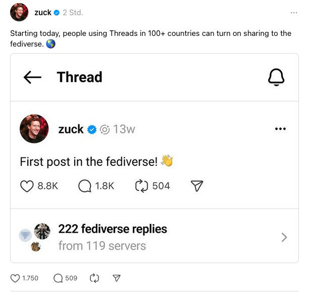 Also er sagt, dass ab heute es in über 100 Länder möglich sein wird, seine Post mit dem Fediverse zu teilen. Ebenfalls wurde bekannt, dass die Funktionen vom Fediverse noch besser erfasst werden. Bisher wars in den Testaccount nur möglich dass man Posts im Fediverse lesen konnte, aber wenn man auf einen Post antwortete, dann konnten die Leute es in Threads nicht lesen.