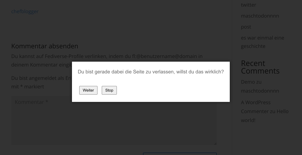 Ich stand vor dem Problem dass ein Kunde unbedingt seine Webseitenbesucher warnen wollte, dass sie die Webseite verlassen. Er hat gehört, dass Kunden davon abgehalten werden müssen um die Conversion-Rate hoch zu halten. Ich habe das auch schon öfters gesehen und finde das immer sehr mühsam. Aber ihr wisst ja sicher wie das ist – Kunden wunsch wird manchmal halt umgesetzt auch wenn man es nicht unbedingt will.