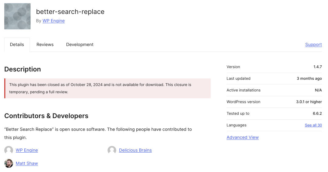 Diesmal hat es das sehr beliebte Better Search Replace Plugin ausgesucht. Aber diesmal war ihm die „klau“ Arbeit wohl zu anstrengend – also hat er das Plugin einfach verboten.
