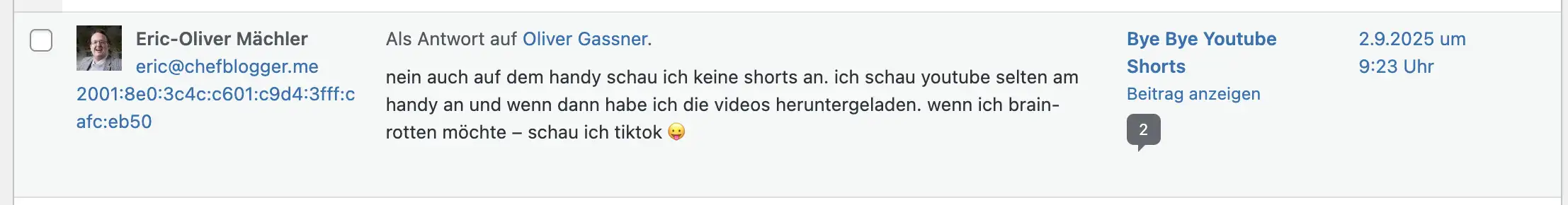 Normalerweise sieht ein Kommentar so in der Kommentarseite im Dashboard aus