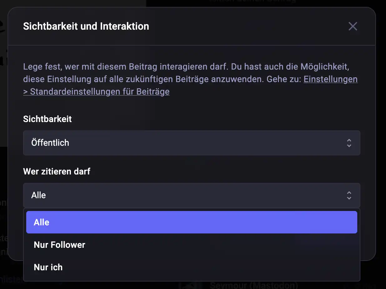Es gibt jetzt nämlich eine neue Einstellungsmöglichkeit wo man direkt bestimmen kann, wer ein Zitat aus meinem Trööt / Post machen darf.