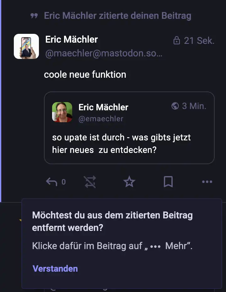 Am Donnerstag kam die neue Mastodon Version heraus Version 4.5 und die hat eine sehr umstrittene Funktion gebracht und zwar die Zitatefunktion.