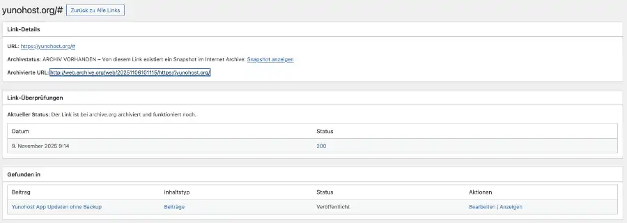 Sollte man mehr wissen wollen zu einem dieser einzelnen Link, dann kann man mit einem Klick so eine Detailseite aufrufen, man sieht den Link, den Link bei der Wayback Machine und den Status der letzten Überprüfungen.