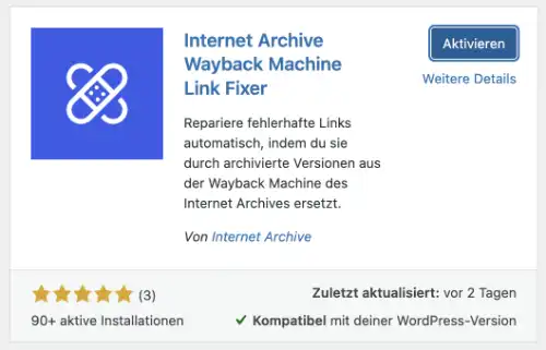 Wenn man das Plugin installieren möchte, kann man das direkt über Plugins in WordPress machen – sucht einfach nach „Internet Archive Wayback Machine Link Fixer„. Einfach suchen und installieren und aktivieren.