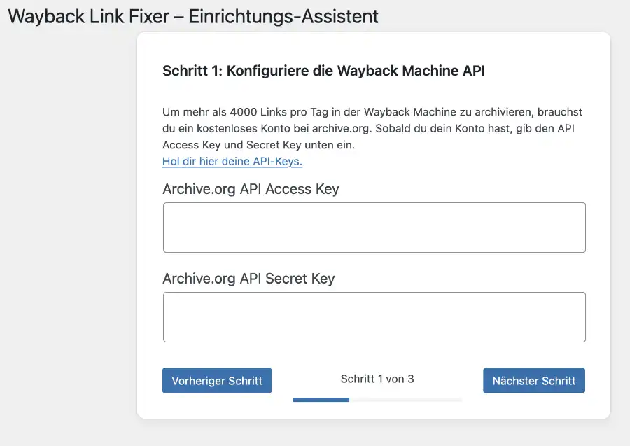 Danach wird man nach API Key gefragt aber die kann man sehr schnell machen lassen. Einfach auf den Link in der Meldung klicken und dann müsst ihr nur noch ein Account bei er Wayback Machine erstellen (ist kostenlos) und wenn ihr eingeloggt seid, dann klickt nochmal auf den Link in der Meldung und schon könnt ihr eure API Key generieren. Hat bei mir nicht mal 5min gedauert.