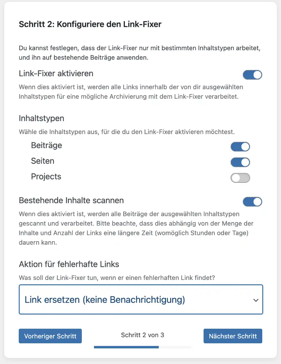 Im nächsten Schritt kannst du einstellen mit welchen Typen dieses Plugin arbeiten soll und überwachen soll und was es unten tun soll. Ich habe keine Projekte hier sonern nur Seiten und Beiträge also habe ich einfach auf ≪Nächster Schritt≫ geklickt.