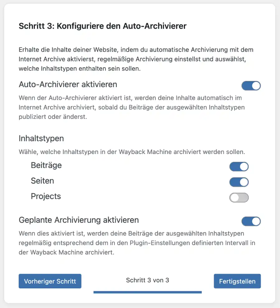 Als nächstes kann ich definieren welche Seite von meiner URL archiviert werden soll. Auch hier habe ich nichts gemacht sondern einfach auf Fertig gestellt geklickt.