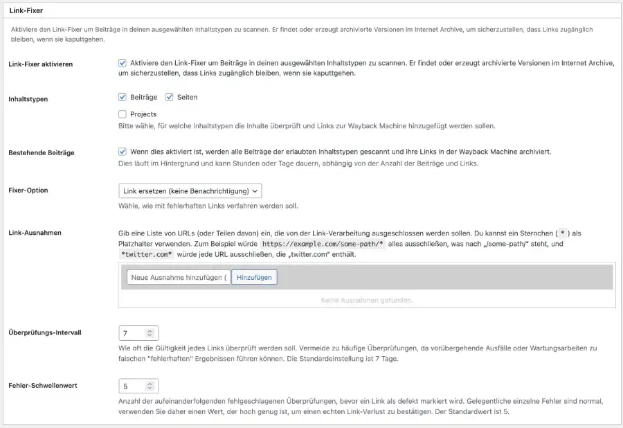Unter Einstellungen im Menu kann ich dann einstellen wie oft ein Link gecheckt werden muss bis er als „Fehlerhaft“ gekennzeichnet wird und ausgetauscht wird.