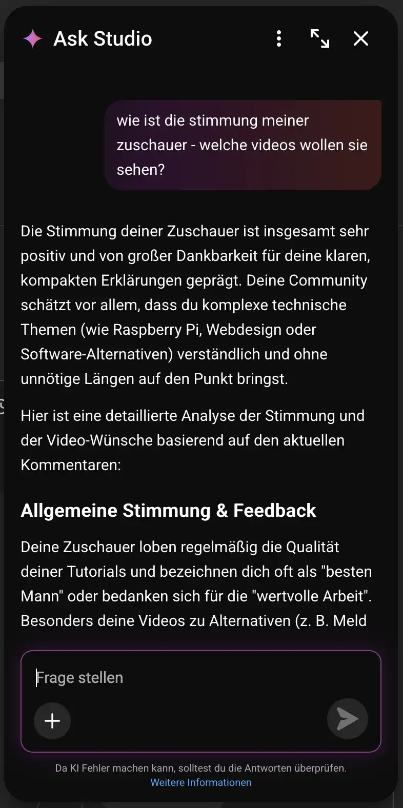 Natürlich habe ich dann weiter gebohrt und die KI sagte mir, dass die Stimmung meiner Zuschauer sehr positiv sei.