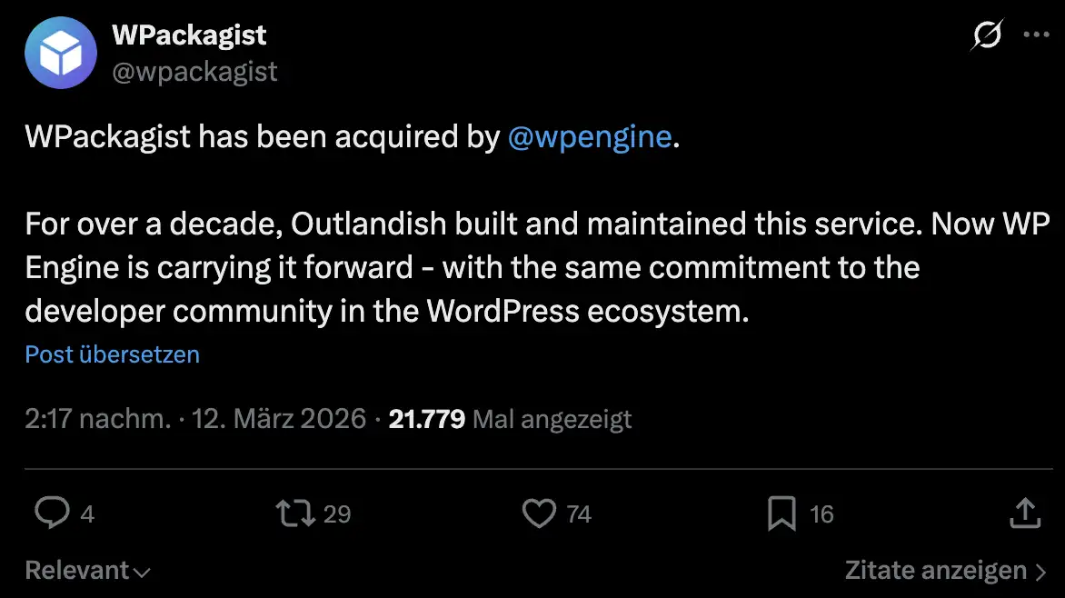 Natürlich hat WPackagist den Verkauf auch auf Twitter / X verkündet.