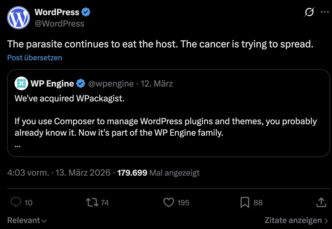 Ebenfalls habt ihr von der Firma auch schon gehört, und zwar im Zusammenhang mit dem WordPress-Krieg. Der verrückte König Mad Mullenweg hat ja diese Firma als Krebs bezeichnet und diese Firma dann verklagt und wurde gegenverklagt. Und ja, die Prozesse laufen immer noch. Hier könnt ihr die ganze Geschichte nachlesen über den WordPress Krieg