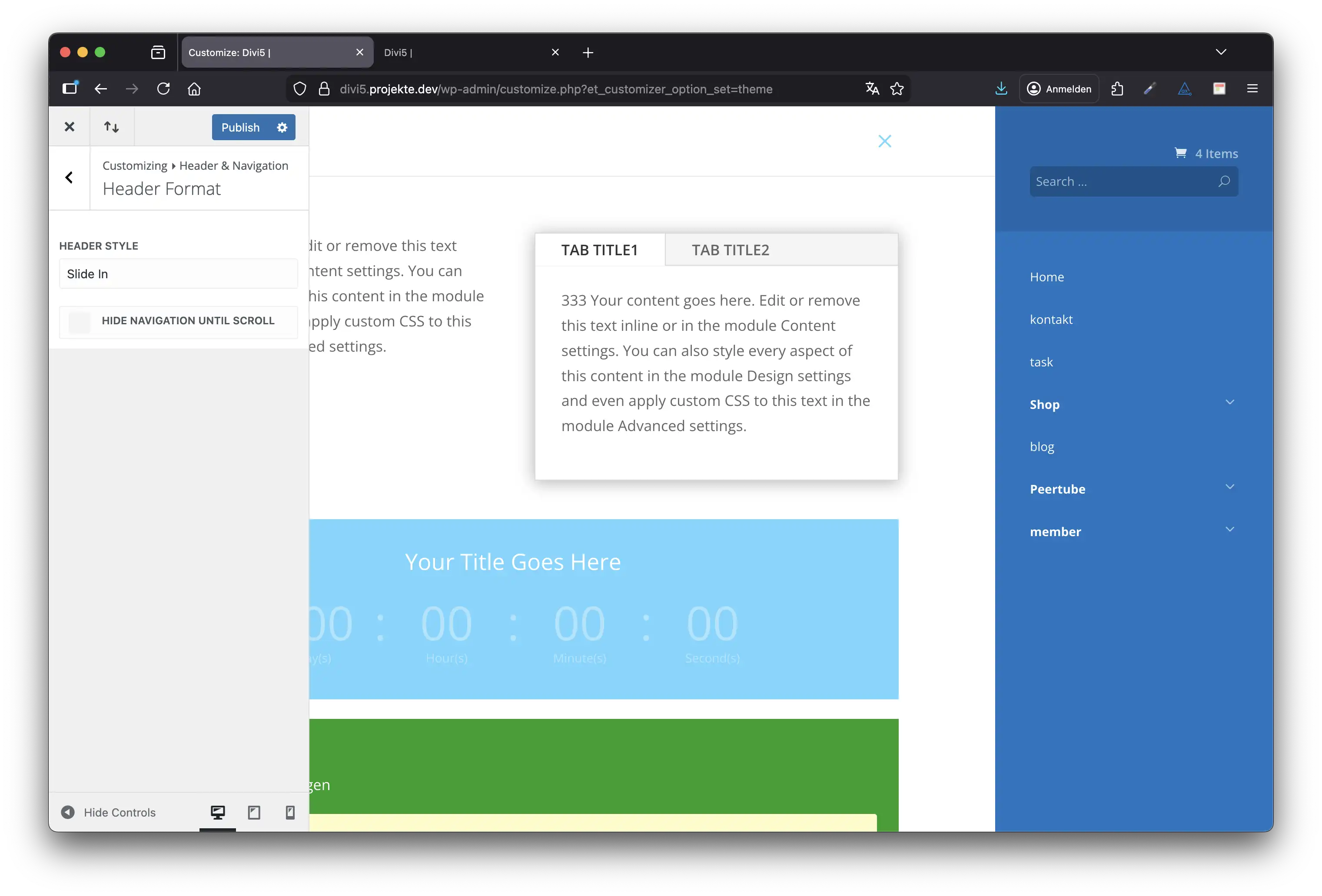 Danach könnt ihr direkt unter Divi → Theme Customizer gehen und dort auf Header & Navigation klicken. Jetzt sehen wir die verschiedenen Designvarianten.